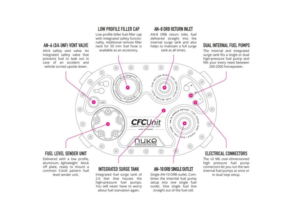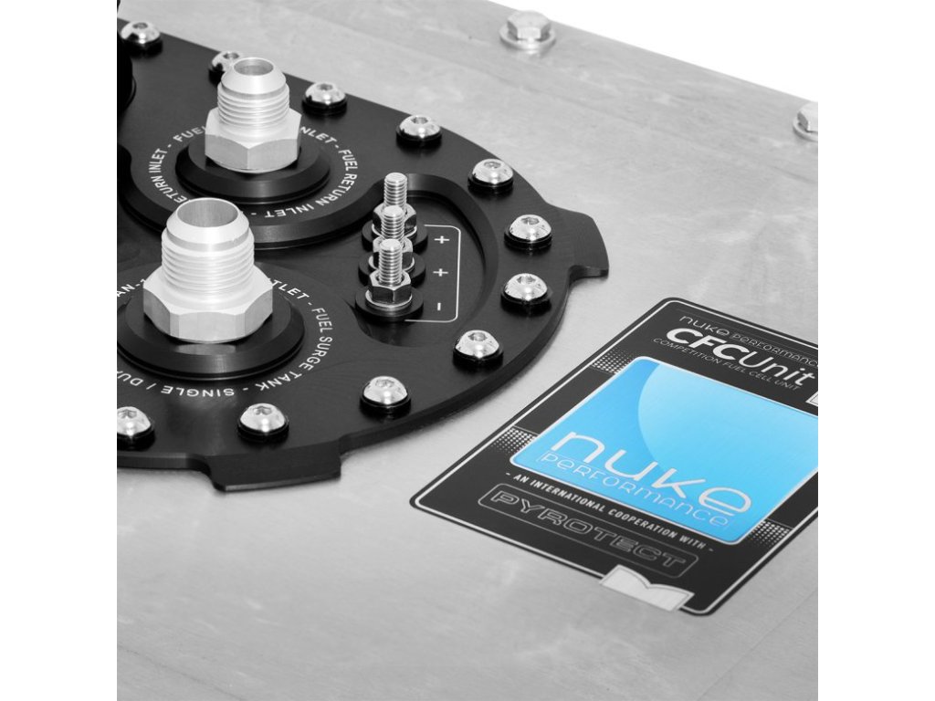 Nuke Performance CFC Unit – Low profile Competition Fuel Cell Unit s integrovanou palivovou vyrovnávací nádrží je vybavena závity ORB namísto závitů UNF, které používaly na začátku. Výstupní port AN-10 ORB a zpětný port AN-8 ORB umožňují vybrat si ze široké škály různých dostupných fitinek typu ORB s různými úhly a přechody na všechny možné velikosti. Velký výstup typu AN-10 ORB s vysokým průtokem spojuje vnitřní palivová čerpadla do jednoho palivového vedení a minimalizuje potřebu externích pump, hadic, Y-bloků a fitinek. Součástí CFC Unit je i zpětný ventil s ochranou proti úniku paliva při převrácení o velikosti AN-6 (3/4 UNF) a v případě potřeby ho lze vyměnit za velikost až AN-10. Fitinky na výstup i vratku o velikostech AN-6, AN-8, AN-10 a AN-12 se prodávají samostatně jako příslušenství.