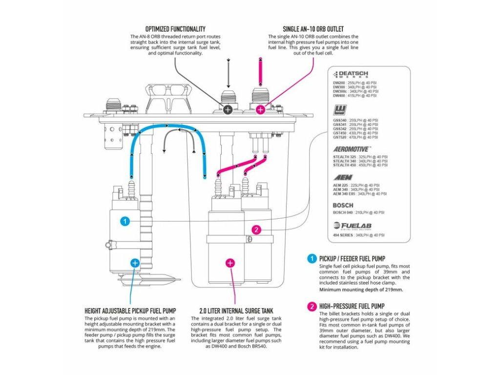 - Integrovaná 2 litrová vyrovnávací nádrž a držák až na dvě vysokotlaké in-tank palivové pumpy