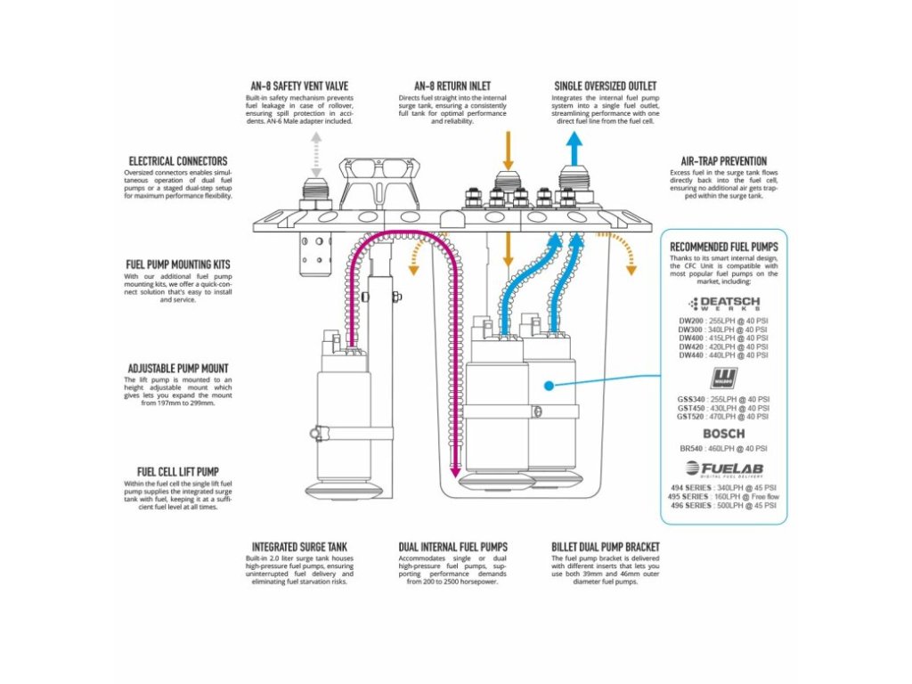 Jedno palivové čerpadlo namontované volně v palivové nádrži funguje jako podávací a zajišťuje, že vysokotlaká palivová čerpadla v rozměrné 2,0litrové vyrovnávací nádrži budou mít vždy dostatek paliva k maximálnímu krmení motoru. Nedostatek paliva může způsobit nejen pokles výkonu, ale i vážně poškodit motor, proto je CFC jednotka postavena tak, aby se to nestalo. Jednotka CFC je dodávána se vším, co potřebujete k instalaci palivových pump dle vašeho výběru, ale pro optimální funkčnost doporučujeme přidat jednu z našich montážních sad palivových čerpadel. Všechna palivová čerpadla lze bezpečně namontovat díky důmyslně umístěným pevným držákům na spodní straně jednotky.