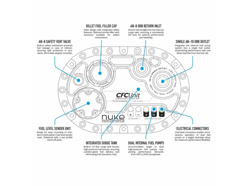 Nuke Performance CFC Unit – Low profile Competition Fuel Cell Unit s integrovanou palivovou vyrovnávací nádrží je vybavena závity ORB namísto závitů UNF, které používaly na začátku. Výstupní port AN-10 ORB a zpětný port AN-8 ORB umožňují vybrat si ze široké škály různých dostupných fitinek typu ORB s různými úhly a přechody na všechny možné velikosti. Velký výstup typu AN-10 ORB s vysokým průtokem spojuje vnitřní palivová čerpadla do jednoho palivového vedení a minimalizuje potřebu externích pump, hadic, Y-bloků a fitinek. Součástí CFC Unit je i zpětný ventil s ochranou proti úniku paliva při převrácení o velikosti AN-6 (3/4 UNF) a v případě potřeby ho lze vyměnit za velikost až AN-10. Fitinky na výstup i vratku o velikostech AN-6, AN-8, AN-10 a AN-12 se prodávají samostatně jako příslušenství.