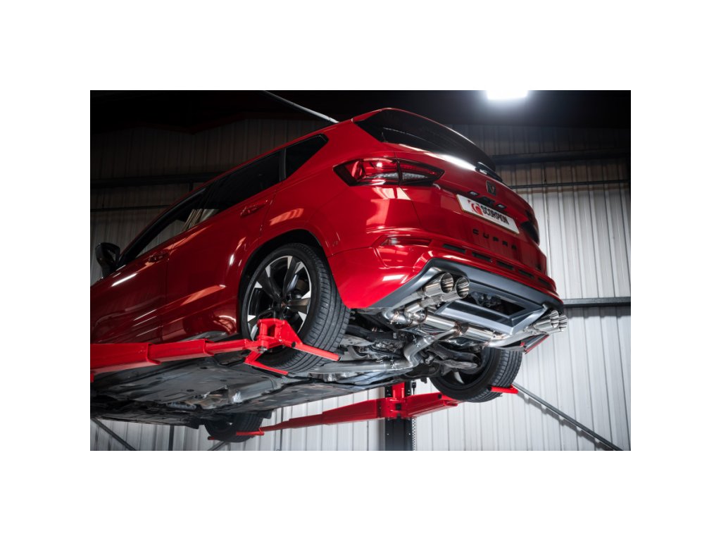 Non-resonated gpf back výfuk s klapkami od anglické firmy Scorpion pro CUPRA Ateca 2,0 TSI 4Drive 300. Všechny produkty této společnosti jsou vyráběny ručně ve Velké Británii a jsou využívány v závodních šampionátech BTCC, VW Cup, Mini Challenge a dalších.