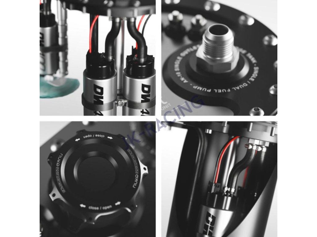 Nuke Performance CFC Unit – Low profile Competition Fuel Cell Unit s integrovanou palivovou vyrovnávací nádrží je vybavena závity ORB namísto závitů UNF, které používaly na začátku. Výstupní port AN-10 ORB a zpětný port AN-8 ORB umožňují vybrat si ze široké škály různých dostupných fitinek typu ORB s různými úhly a přechody na všechny možné velikosti. Velký výstup typu AN-10 ORB s vysokým průtokem spojuje vnitřní palivová čerpadla do jednoho palivového vedení a minimalizuje potřebu externích pump, hadic, Y-bloků a fitinek. Součástí CFC Unit je i zpětný ventil s ochranou proti úniku paliva při převrácení o velikosti AN-6 (3/4 UNF) a v případě potřeby ho lze vyměnit za velikost až AN-10. Fitinky na výstup i vratku o velikostech AN-6, AN-8, AN-10 a AN-12 se prodávají samostatně jako příslušenství.