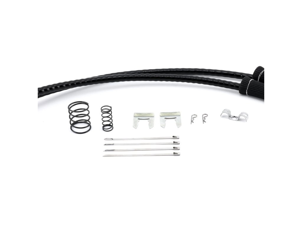The kit comes with two shifter cables; each shifter cable set includes two cotter pins, clips for the shifter end, and transmission selector lever springs. Each set also comes with a new rubber grommet for the hole in your firewall. Also, all shifter cables come with upgraded transmission gear selector springs. These aren't required but are recommended to further improve your driving experience. We also include a pair of thermal protective sleeves which will help protect them from your exhaust.