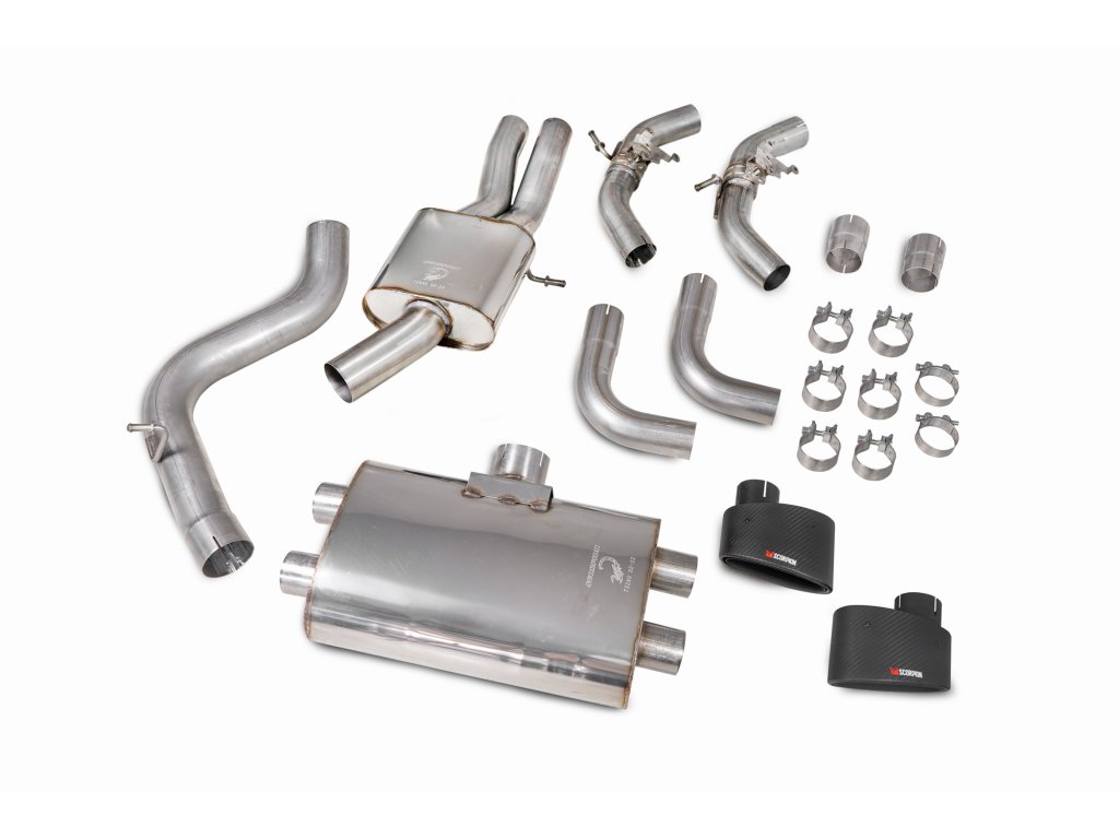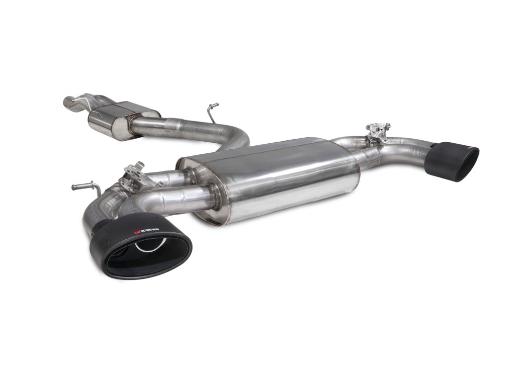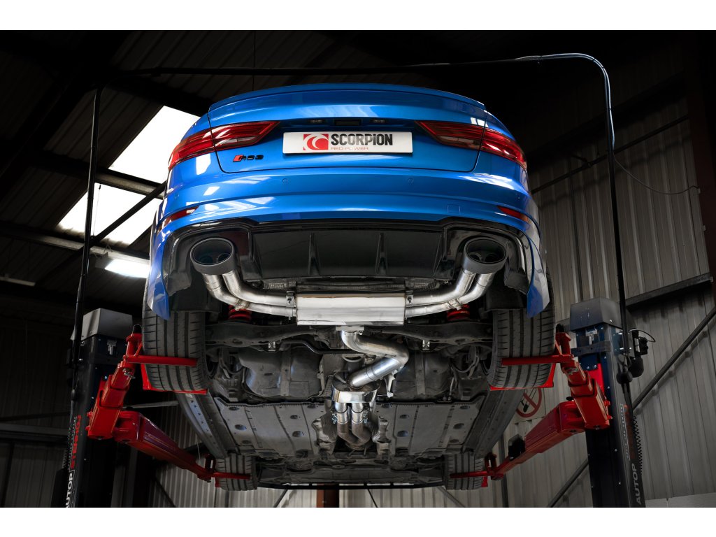 Resonated cat/gpf-back výfuk s klapkami od anglické firmy Scorpion pro Audi RS3 Saloon 8V (GPF a Non- GPF models). Všechny produkty této společnosti jsou vyráběny ručně ve Velké Británii a jsou využívány v závodních šampionátech BTCC, VW Cup, Mini Challenge a dalších.