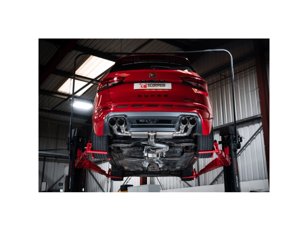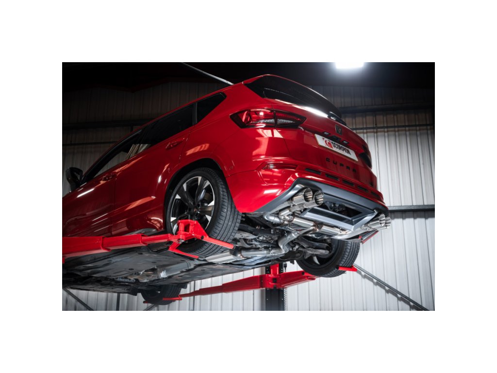 Resonated gpf back výfuk bez klapek od anglické firmy Scorpion pro CUPRA Ateca 2,0 TSI 4Drive 300. Všechny produkty této společnosti jsou vyráběny ručně ve Velké Británii a jsou využívány v závodních šampionátech BTCC, VW Cup, Mini Challenge a dalších.