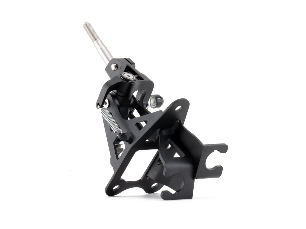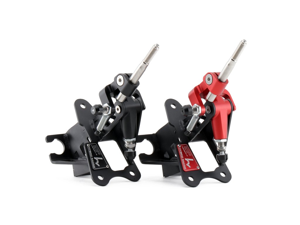 The shifter’s frame is constructed from TIG welded, powder coated, 1000 Series steel. The Dust-Gold anodized upper and lower rocker assemblies are now made of single pieces of Aerospace aluminum and feature custom sealed ball bearings to reduce friction. The new V2 shifter is 60% smoother than the original version requiring much less physical effort to row through gears all while being significantly lighter. Shift throw adjustment is achieved using two threaded cable attachment pins, meaning fine tweaks can be made to shift throw, allowing you to dial in the exact throw that suits your shifting style. Each attachment pin features a wear-resistant Delrin pivot cap for sturdy, quiet operation. New dual, zinc-plated extension springs replace the OEM style torsion centering spring for better-centering action and a more direct feel.