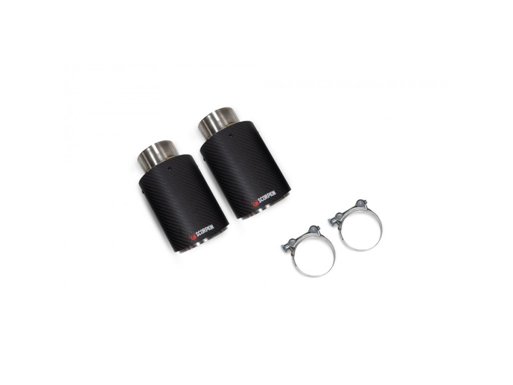 100mm karbonové Ascari koncovky (sada) od anglické firmy Scorpion. Všechny produkty této společnosti jsou vyráběny ručně ve Velké Británii a jsou využívány v závodních šampionátech BTCC, VW Cup, Mini Challenge a dalších.